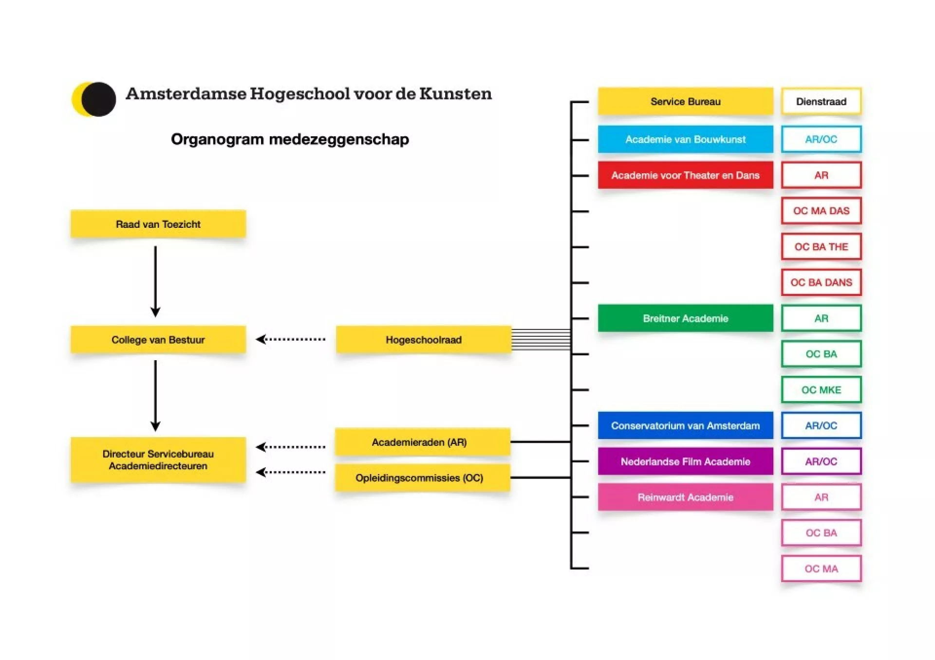 Overeenkomstig de bestuurlijke structuur van de AHK zijn in het medezeggenschapsreglement AHK de advies- en instemmingsbevoegdheden toebedeeld aan de Hogeschoolraad (HR), de academieraden (AR), de opleidingscommissies (OC) en de Dienstraad Servicebureau (DR SB). De wijze van verkiezen of benoemen is vastgelegd in het Kiesreglement Medezeggenschap. Alle medezeggenschapsgremia worden ondersteund vanuit Bureau Medezeggenschap met een ambtelijk secretaris.
